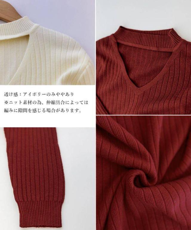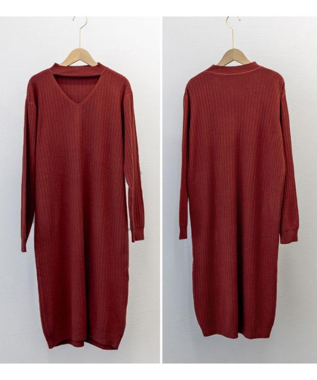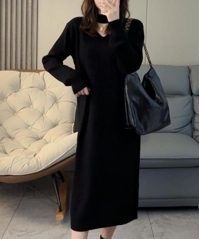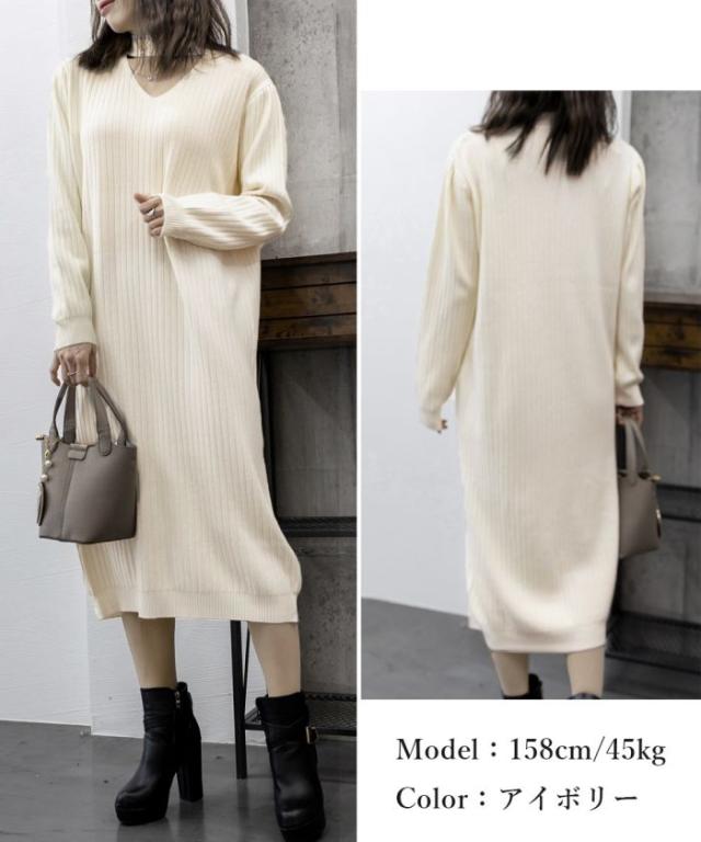 リブニットワンピース ロング丈 vネック 秋服 秋新作