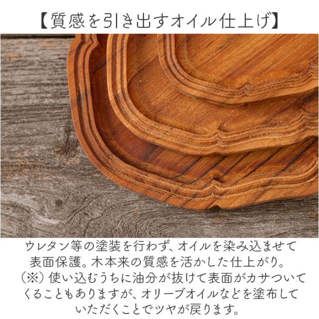 | 商品説明 | 【いつもの食卓に特別感を♪】 ・おやつなどがキレイに映えて、一気に華やぐ♪「Oval tray S」が新登場。 【アンティーク調の雰囲気をプラス】 ・ナチュラルなチーク材を使用。繊細なリムのレリーフが美しい木目を際立たせ、グッとおしゃれに。 【1点1点異なる風合いも魅力の1つ】 ・表情やサイズに若干の違いがあり自然にできた穴や木目も様々。チークの香りも感じる一点もの♪ 【質感を引き出すオイル仕上げ】 ・ウレタン等の塗装を行わず、オイルを染み込ませて表面保護。木本来の質感を活かした仕上がり。 (※)使い込むうちに油分が抜けて表面がカサついてくることもありますが、オリーブオイルなどを塗布していただくことでツヤが戻ります。 【おうちカフェやパーティーのお供に】 ・ティータイムに焼き菓子を盛り付け。ホームパーティーではフルーツなどを乗せて♪ 【インテリアとしても☆使い方自在】 ・アクセサリー類の一時置きにもぴったりな、コンパクトサイズ。空間に素敵にマッチ! |