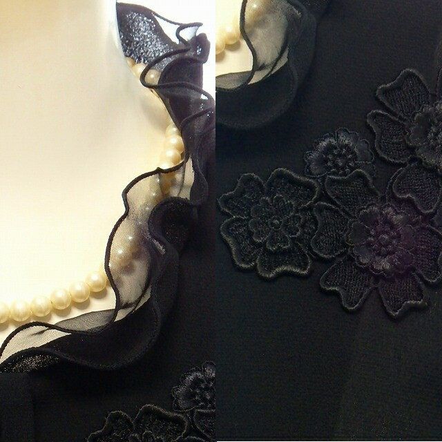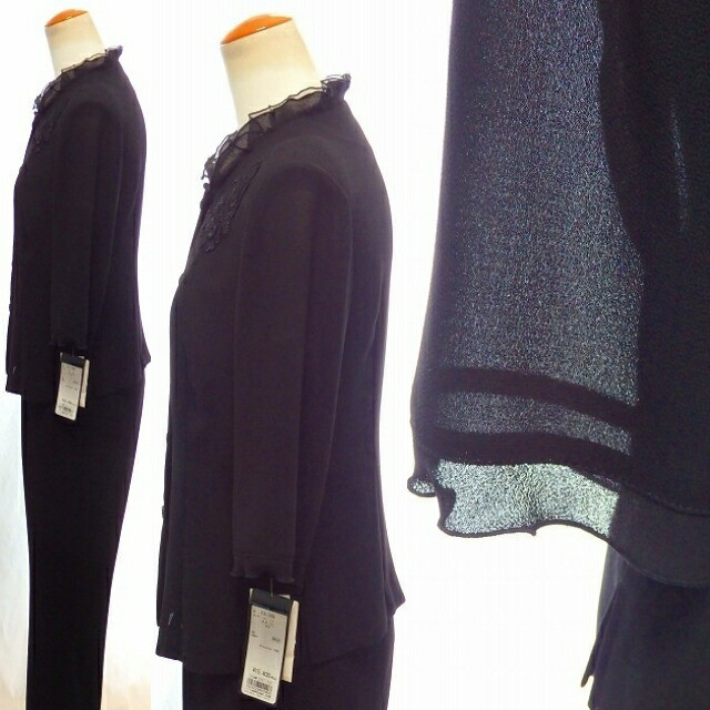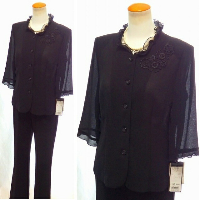 | オーガンジー衿生地 レースモチーフ さらさら肌ざわり 日本製 通気性抜群 スタンドフリル衿 ジャケット+パンツ ブラックフォーマル 夏パンツスーツ |