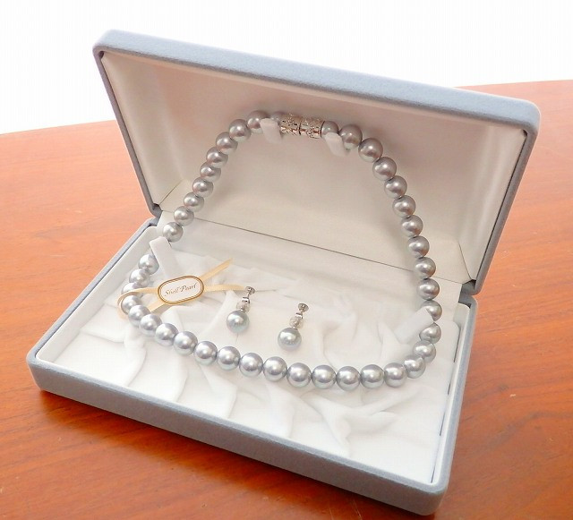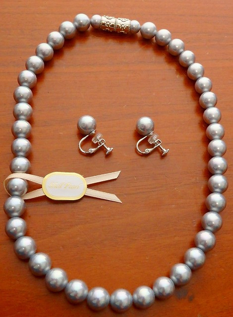 貝パールネックレス・イヤリングセット 10ミリ玉 42センチ グレー色 灰色 日本製 シェルパール マグネット仕様 収納ケース付き 2点セット