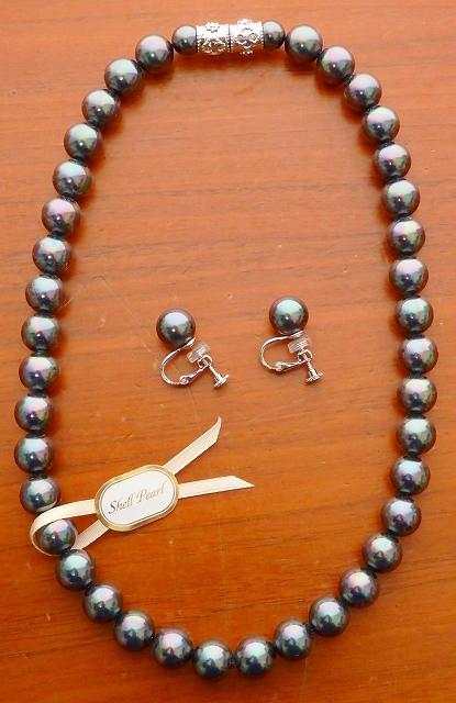 貝パールネックレス・イヤリングセット 10ミリ玉 42センチ ダークグレー色 日本製 シェルパール マグネット仕様 収納ケース付き 2点セット