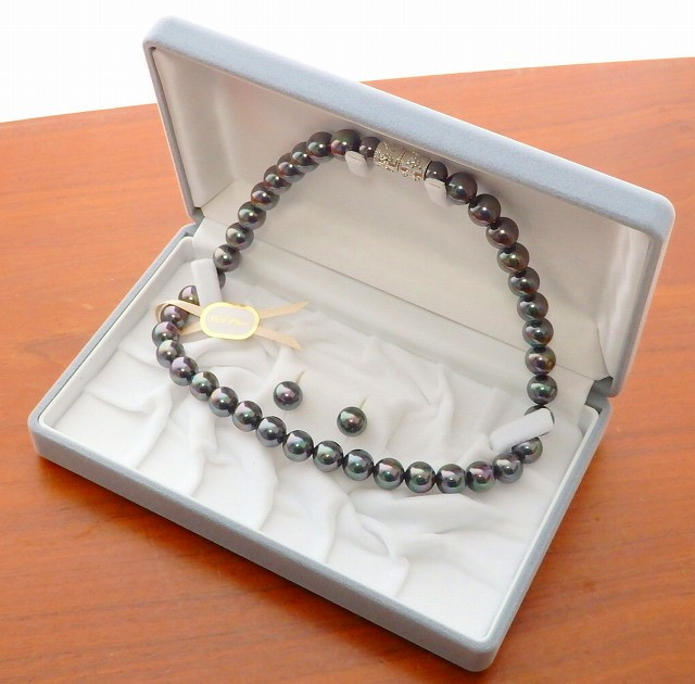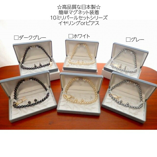 貝パールネックレス・ピアスセット 10ミリ玉 42センチ 人気 ダークグレー色 日本製 シェルパール マグネット仕様 収納ケース付き 2点セット