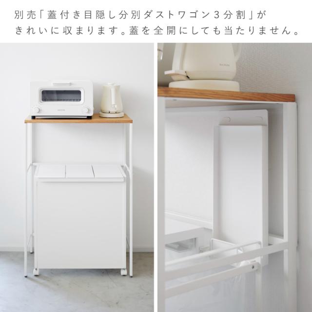 別売の「蓋付き目隠し分別ダストワゴン タワー 3分別」がきれいに収まり、蓋を全開しても天板にあたりません。替え用のゴミ袋などはバーに掛けておくことができて便利です。