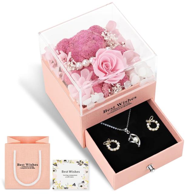 ・??プリザーブドフラワーと可愛らしいクマさん一緒に可愛い蘚苔クマさん、プリザーブドフラワーのジュエリーボックスにロマンスを添えます。蘚苔クマさんと貴重なマイクロローズのプリザーブドフラワーを透明アクリルにぎゅっと詰め込み。バラを抱えた、ふわふわの蘚苔クマが想いを届けます。