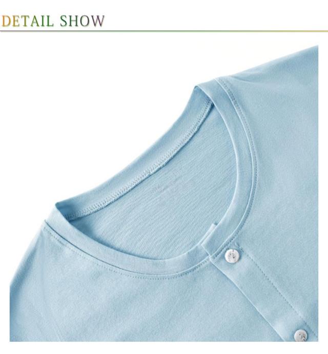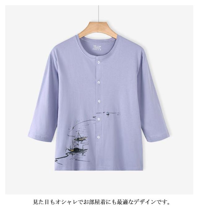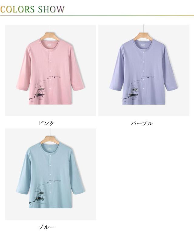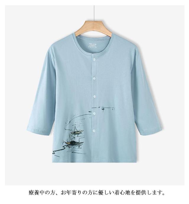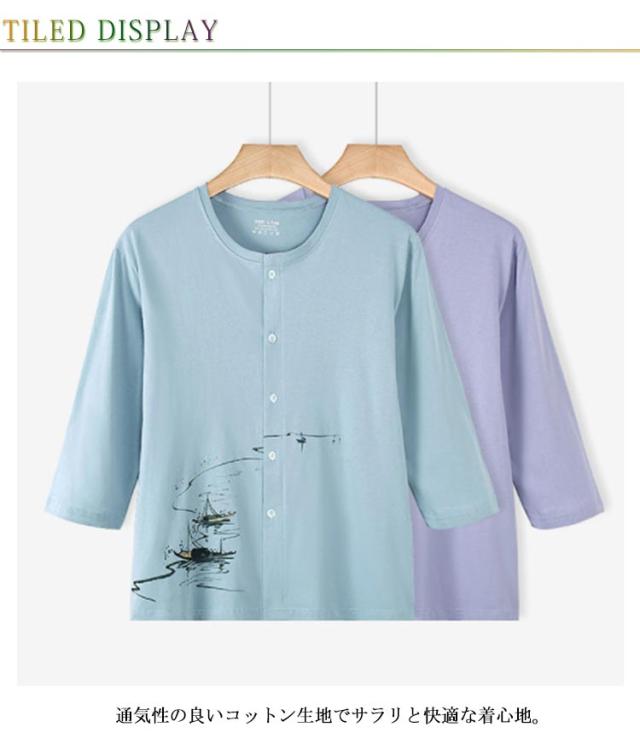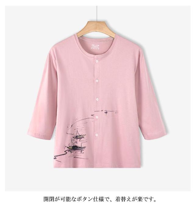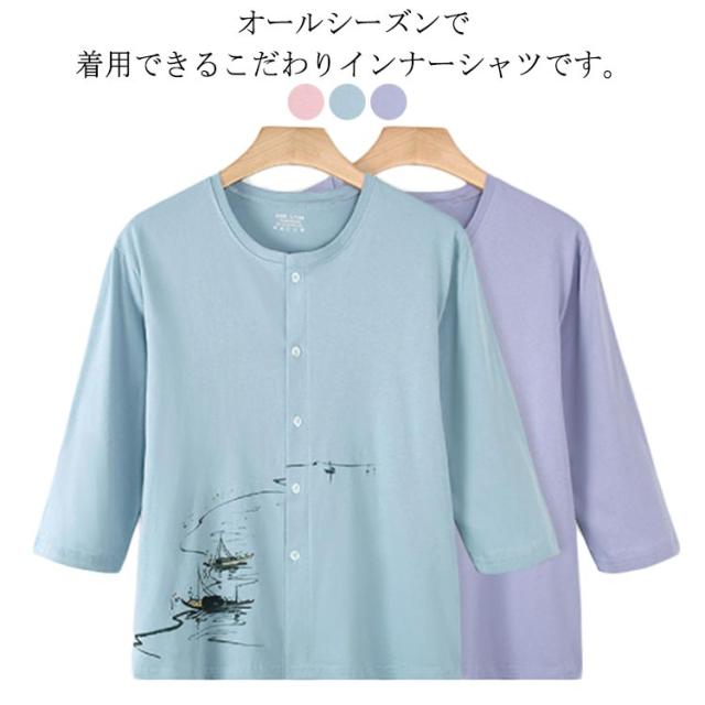 Tシャツ インナーシャツ レディース トップス 7分袖 前開き クールネック ルームウェア 下着 肌着 無地 吸汗性 入院 手術 介護用 部屋着 女性用 大きいサイズ 春秋 お洒落 送料無料
