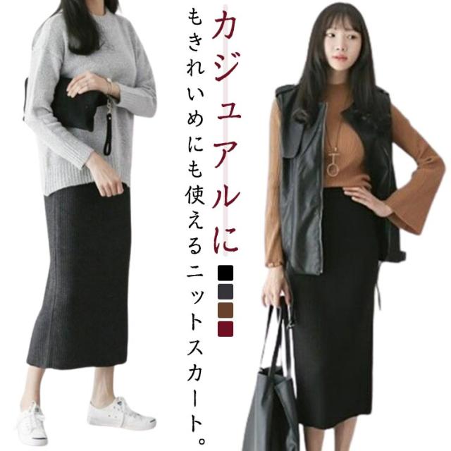 スカート リブニット タイトスカート ロングスカート ニットスカート 大きいサイズ アレディース 秋冬 ボトムス Iライン ウエストゴム きれいめ 美脚 ストレート 着痩せ ストレッチ性 スリット入り お洒落 オフィス OLさん 送料無料