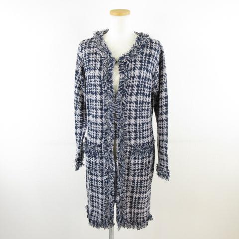 【中古】サロン SALON Pixie Heart ニットカーディガン フリンジ ロング 千鳥格子 長袖 紺 白 L *A418 レディース