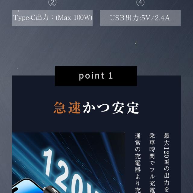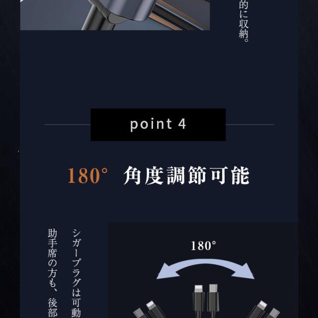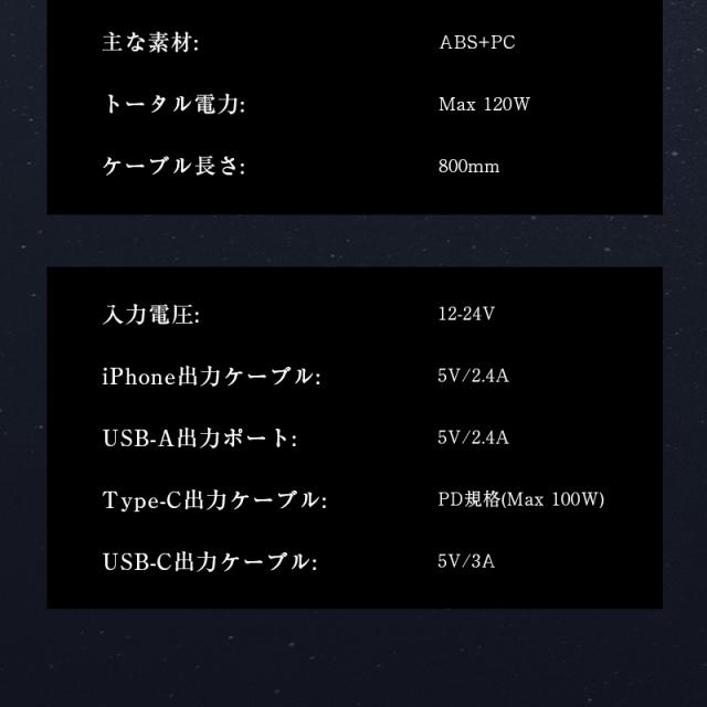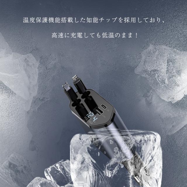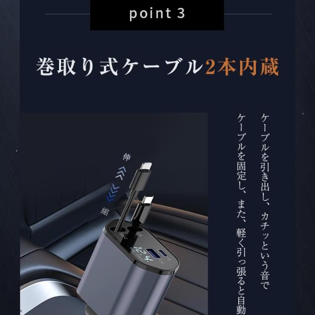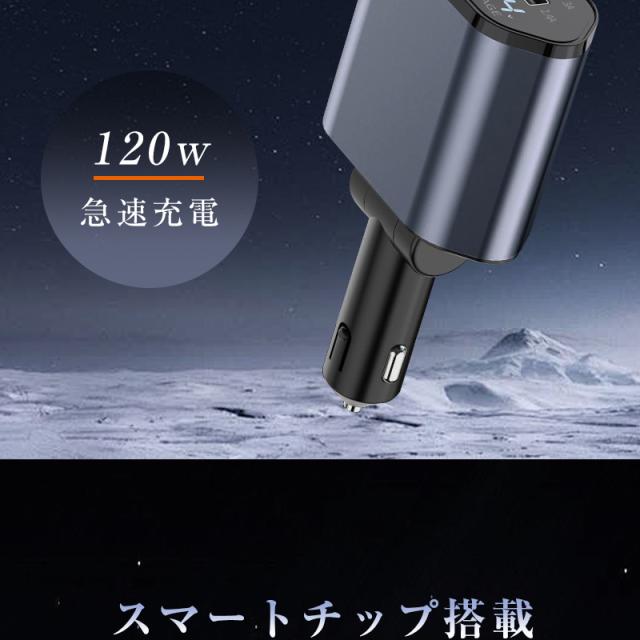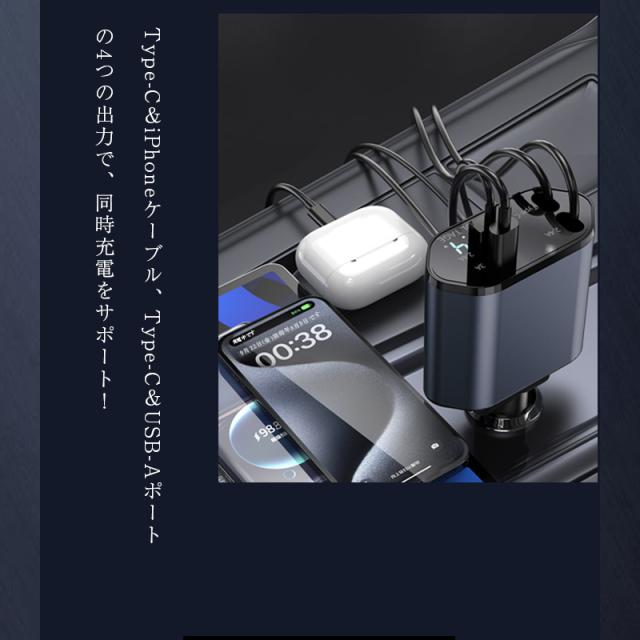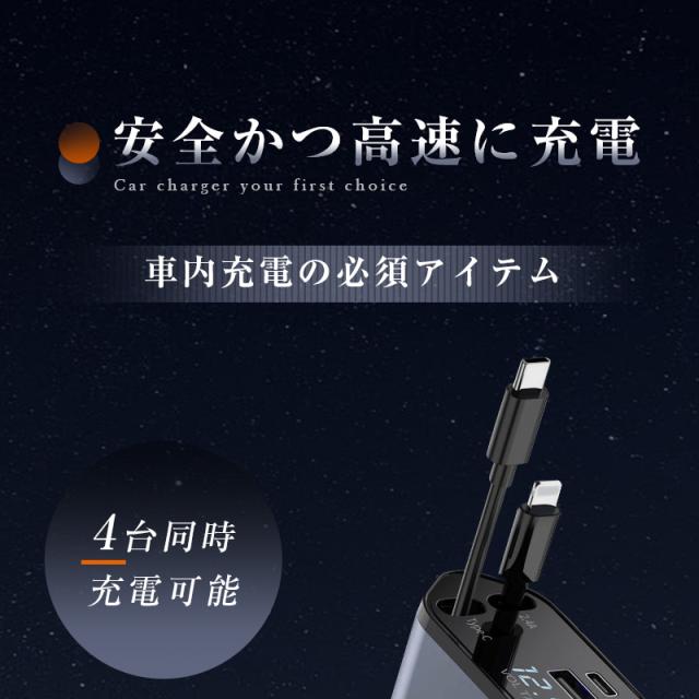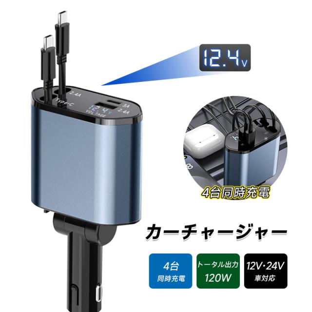 カーチャージャー 12V・24V車対応 120W シガーソケット 車載充電器 高速充電 巻取り式ケーブル Type-Cケーブル 急速充電 iPhoneケーブル Type-C出力ポート 【PL保険加入済み製品・安心】