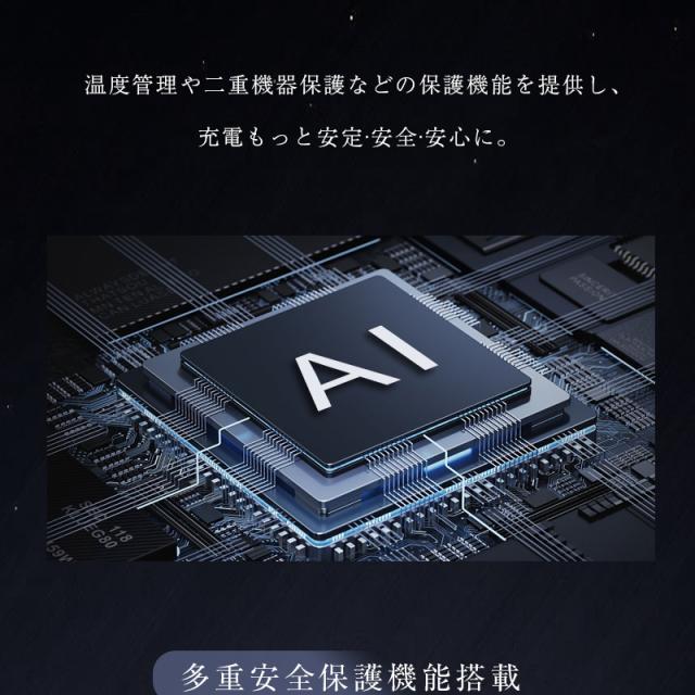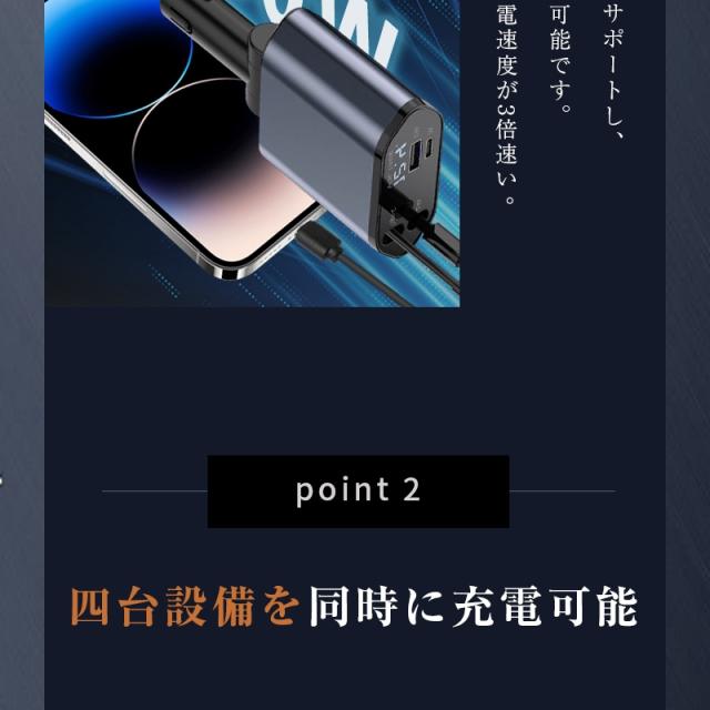 Type-C出力ケーブル、iPhone出力ケーブル、Type-Cポート、USB-Aポートの4つの出力で、iPhoneやAndroidスマホに限らず、ゲーム機やタブレット、Bluetoothイヤホンなど、幅広いデジタル製品の充電に対応しています。最大4台のデバイスを同時に充電することができます。