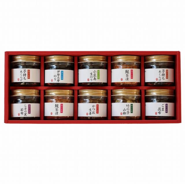 【竹の子山椒】竹の子(中国産)、蛋白加水分解物、砂糖、実山椒/ソルビット、調味料(アミノ酸等)、甘味料(ステビア、甘草)、増粘多糖類、(一部に大豆を含む)【子持ち木くらげ】木耳(中国産)、醤油、砂糖、魚卵、しその実/ソルビット、調味料(アミノ酸等)、香料、甘味料(ステビア、甘草)、酸味料、増粘多糖類、(一部に大豆・小麦を含む)【しその実若布】若布(国産)、蛋白加水分解物、砂糖、しその実/ソルビット、調味料(アミノ酸等)、香料、甘味料(ステビア、甘草)、(一部に大豆を含む)【伊勢志摩のり】のり(伊勢志摩産)、醤油、水飴、 砂糖、味醂/調味料(アミノ酸等)、カラメル色素、増粘多糖類、(一部に大豆・小麦を含む)【小豆島生のり】のり(小豆島産)、醤油、砂糖、味醂、清酒、水飴、酵母エキス/増粘多糖類、(一部に大豆・小麦を含む)【ごま昆布】昆布(国産)、醤油、砂糖、水飴、ごま/ソルビット、 調味料(アミノ酸等)、甘味料(ステビア、甘草)、増粘多糖類、(一部に大豆・小麦・ごまを含む)【かつお生姜】生姜(国産)、醤油、砂糖、かつお削りぶし、ごま、かつお節エキ ス、食塩/ソルビット、調味料 (アミノ酸等)、酸味料、(一部に大豆・小麦・ごまを含む)【鮭茶漬】鮭ほぐし身(鮭(国産)、食塩)、植物油脂、食塩、発酵調味料/調味料 (アミノ酸等)、トレハロース、着色料(カロチノイド、クチナシ)、(一部にさけ・小麦・大豆を含む)