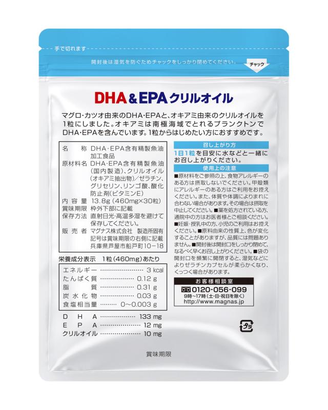 原材料 DHA・EPA含有精製魚油(国内製造)、クリルオイル(オキアミ抽出物)/ゼラチン、グリセリン、リンゴ酸、酸化防止剤(ビタミンE)
