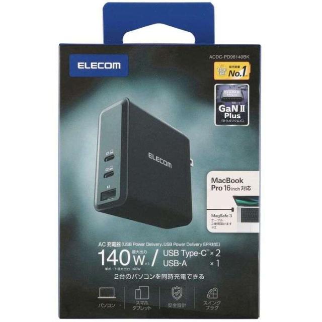 ■USB Power Delivery EPR最大140W(28V/5A) 出力対応USB AC充電器です。16インチMacBook Proを30分でゼロから50%まで高速充電可能です。 ※単ポート接続時、16インチMacBook Proに同梱のUSB-C - MagSafe 3ケーブルを使用の場合 ■16インチMacbook Proに同梱の140W電源アダプターの代替として使用可能。USB Type-Cポート×2、USB-Aポート搭載で幅広い機器の充電に対応しています。出張・ハイブリッドワーク時の持ち運び用に適しています。 ■2ポート接続時:USB Type-Cポート×2を使用の際は、それぞれ65Wの同時出力が可能。ノートパソコンを2台同時に充電できます。 ■2ポート接続時:USB Type-CポートとUSB-Aポートを使用の際は、USB Type-Cポートで100W、USB-Aポートで12Wの出力が可能。ノートパソコンとスマートフォンやスマートウォッチ、ワイヤレスイヤホンなどを同時に充電できます。 ■3ポート接続時:USB Type-Cポート×2、USB-Aポート×1の3ポートを同時に使用する際は、60W+60W+12Wの出力が可能。ノートパソコン・スマートフォン・タブレットなどを3台同時に充電できます。 ■※本製品に接続するケーブルは、ご使用になる機器に合わせて別途ご用意ください。 ■※60〜100W出力には100Wまでの充電に対応したケーブルを、100W以上の出力にはUSB Power Delivery EPR規格に対応した240W対応ケーブルをお使いください。 ■GaN II Plus(窒化ガリウム)を採用し、高出力ながらコンパクトサイズを実現。16インチMacbook Proに同梱の140W ACアダプターと比較して約20%小型化しています。 ■プラグ部分を折り畳むことができるため、バッグの中でもスペースを取りません。幅約30mmとスリムでACタップの隣のコンセントにも干渉しにくく、ビジネスでの外出やリモートワーク、出張、旅行など持ち運びにも便利です。