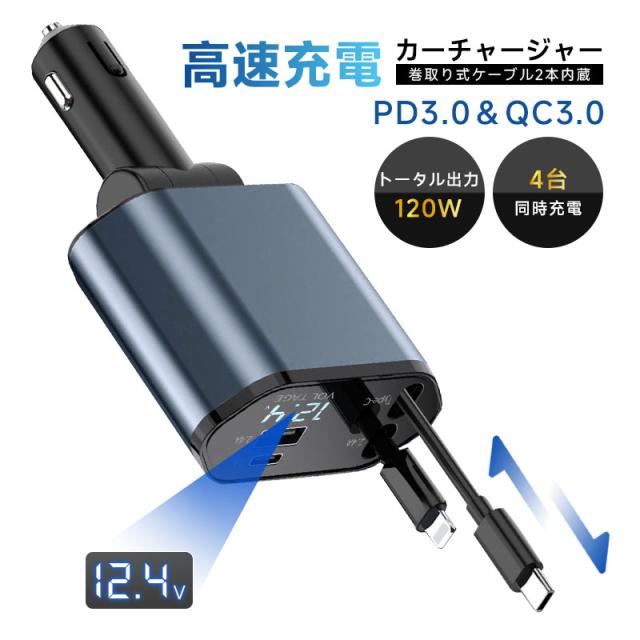カーチャージャー 車載充電器 120W シガーソケット充電器 巻取り式ケーブル 12V・24V車対応 急速充電 4in1折りたたみ式 【PL保険加入済み製品・安心】