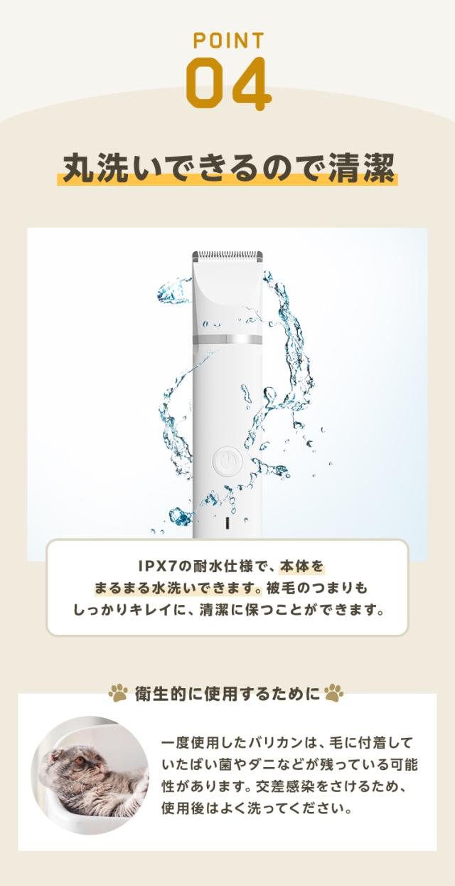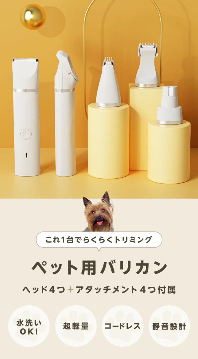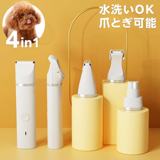ペット、バリカン、コードレスバリカン、トリミング、全身、部分、爪とぎ、爪みがき、ペット用品、犬用品、猫用品、犬、猫、4in1、静音、USB充電、お手入れ簡単、水洗い可能、軽量、使いやすい、持ちやすい、初心者、ペットトリマー、全身カット、部分カット、長さ調整、アタッチメント