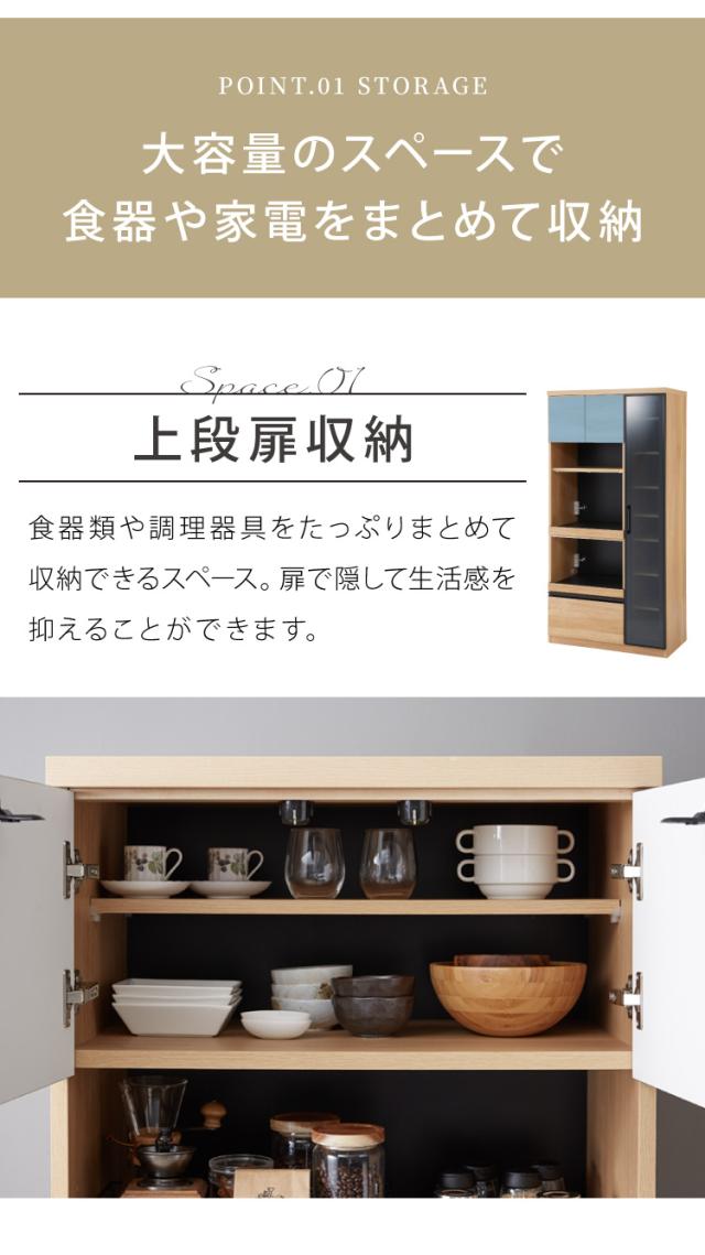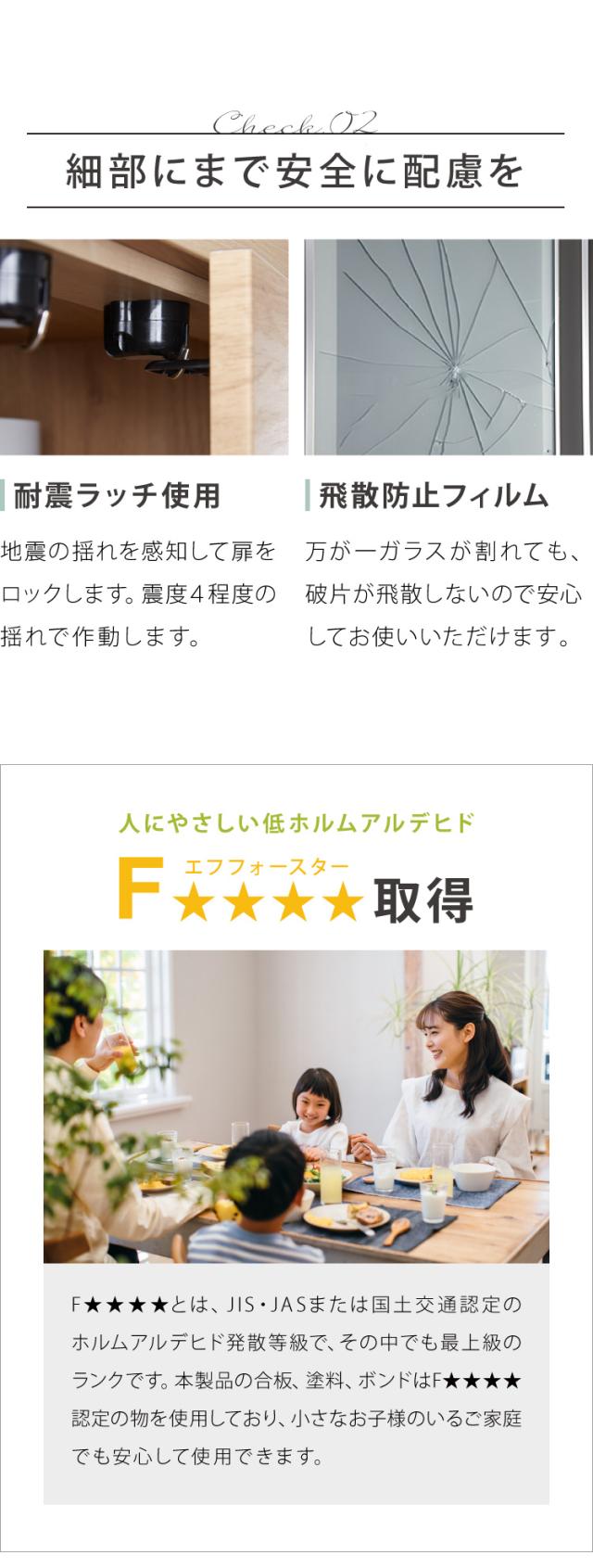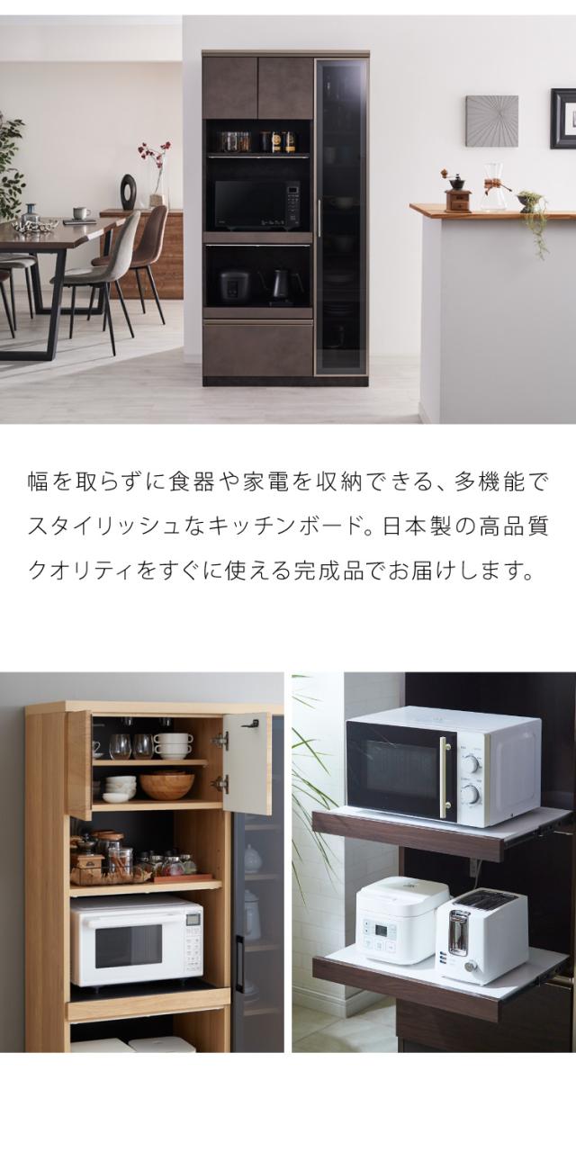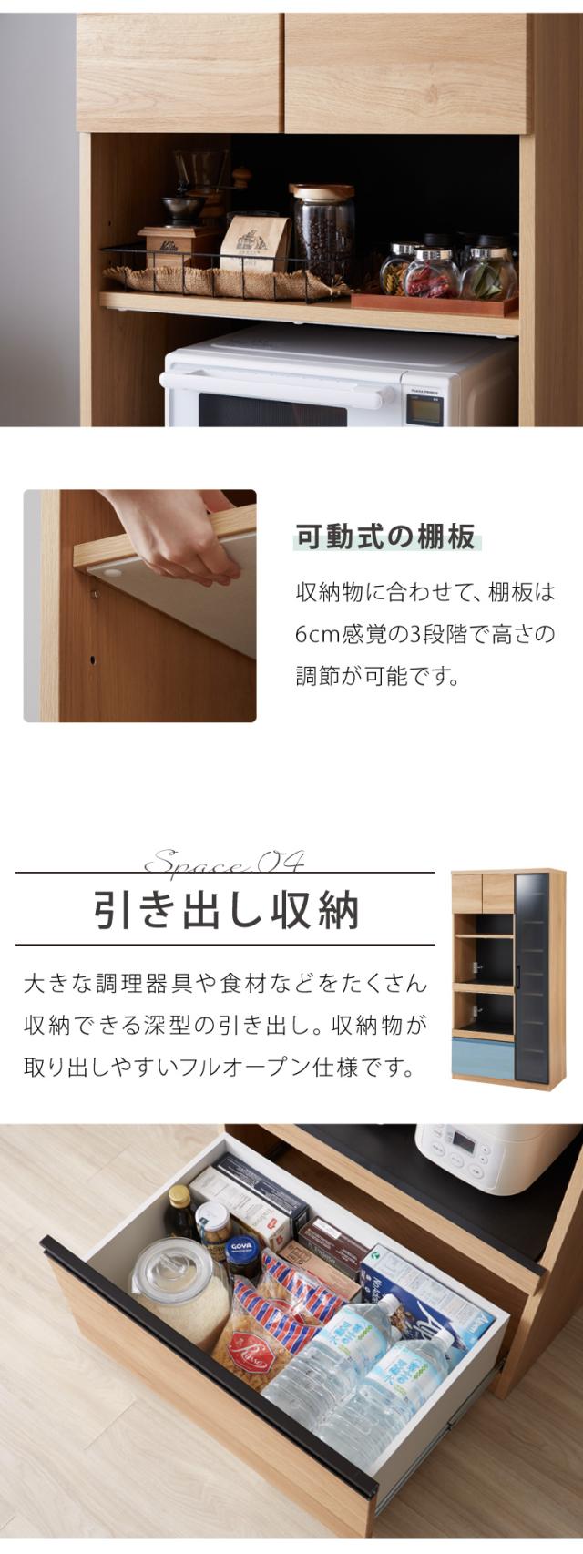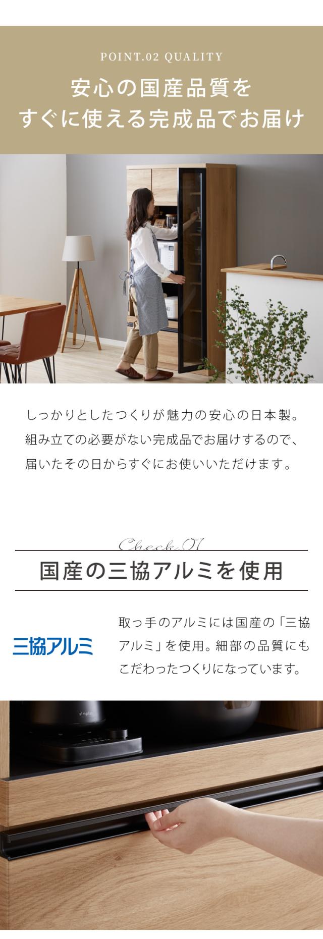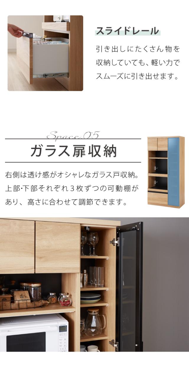 大容量の収納力!幅を取らずに家電と食器両方を収納できます。引き出しは三段フルオープンレール仕様で作られているため、手前までしっかりと出してご使用いただけます。コンセントは耐熱仕様で、トラッキング防止プラグ付きです。扉にはソフトクローズ蝶番が付いているので、扉がゆっくりと締まります。開き戸には耐震ラッチが付いているので揺れの心配も軽減されます。スライド棚にはモイス加工が施されているので、蒸気にも強い仕様です。ガラスは飛散防止フィルム張り仕様です。
