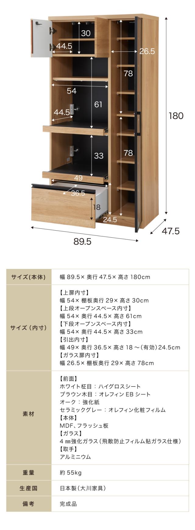 食器棚 幅90 高さ180 モイス加工 国産 完成品 大川家具 ガラス 開梱設置無料 大容量 キッチン収納 収納 キッチンボード ダイニング オーク 鏡面ホワイト ブラウン グレー インテリア ジャパンディ(代引不可)【送料無料】