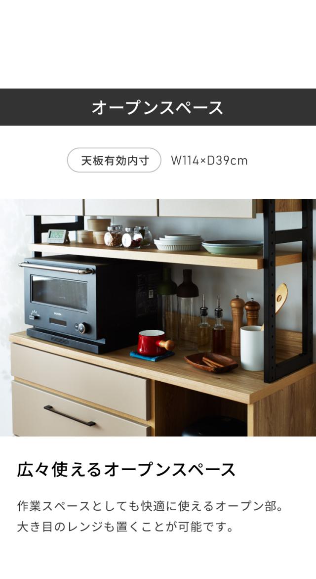 使う人に合わせてキャビネットの棚板部分を高さ調整することができます。大型のレンジも設置できます。