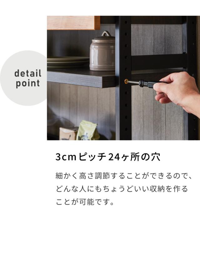 [その他]上部アイアン部固定用ネジ保護キャップ付き(BK色) / 上台の高さ調整可能(キャビネット・棚板部分)※3cmピッチ24カ所