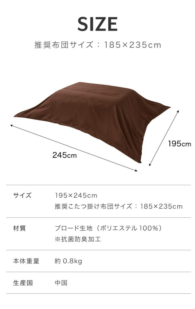 195×245cm(推奨こたつ掛け布団サイズ:幅185×奥行き235cm)