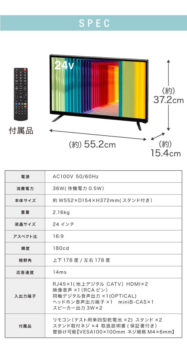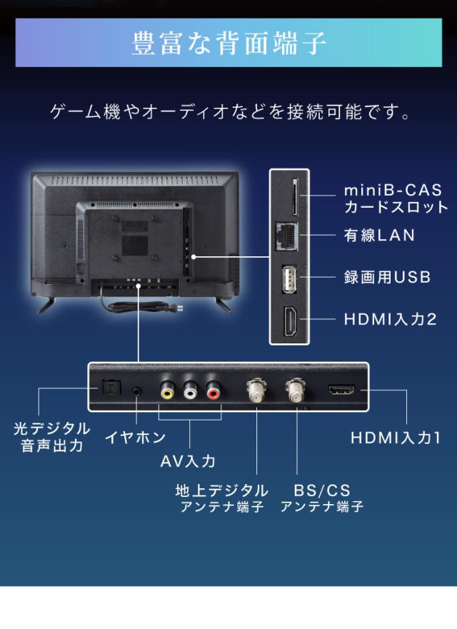 24v、一人暮らし、子供部屋用、テレビ、シンプル、小型、チューナーあり、録画可、番組表、HDMI端子搭載、外付けHDD、液晶、TV、24v型、壁掛、置き型スタンド付、CS、リビング
