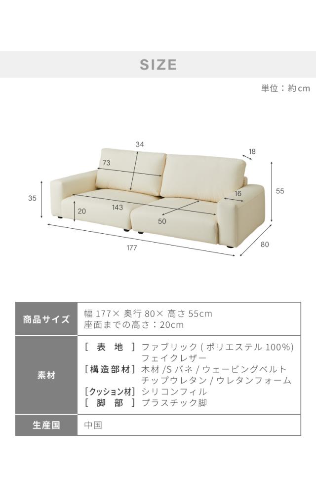 3人掛け(約):幅177×奥行き80×高さ55cm