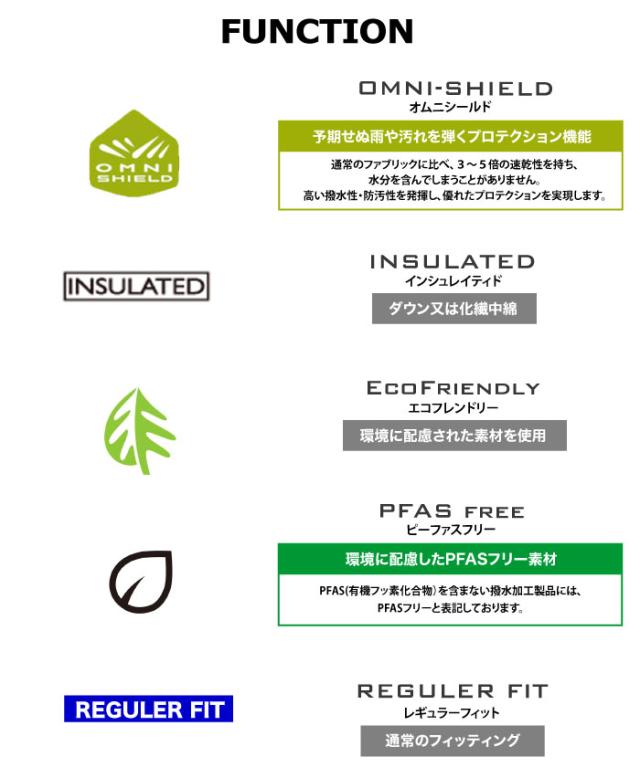雨や汚れを効果的に弾く撥水テクノロジー「オムニシールド」が小雨や砂ぼこりがウェアにつくのを軽減。