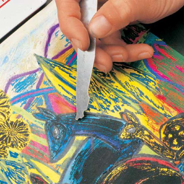 ※例えば、オイルパステルで描いた絵の上にアクリル絵具を薄く塗り、乾かした後にスクレパーで表面の絵具をかきとることでユニークな表現が可能です。