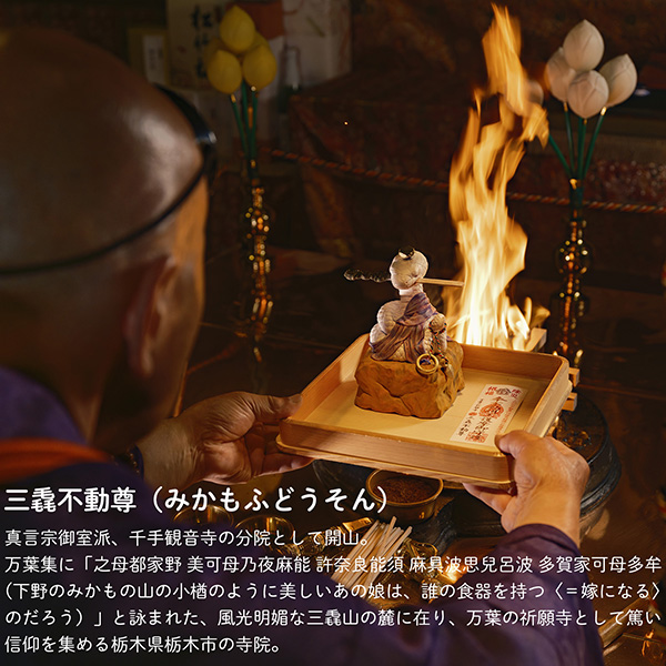 万葉の祈願寺として篤い信仰を集める栃木の三毳不動尊(みかもふどうそん)の小田隆誠御住職による除災招福のありがたい御護摩祈祷を賜ってのお届けとなります。