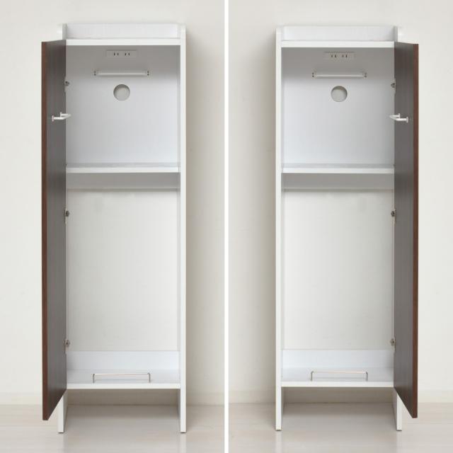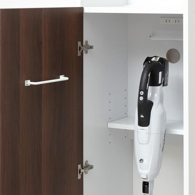 内側の上部には、便利な1500Wの2口コンセントが付いています。収納しながら掃除機の充電が可能です。取っ手とコード穴付きなので、ごちゃごちゃするコードの配線もスッキリと片付きます。