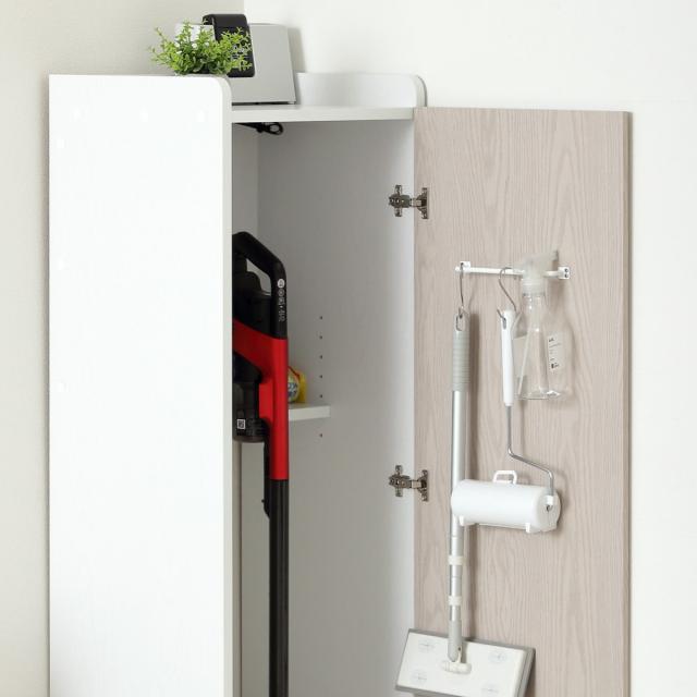 扉の内側に取っ手が付いています。S字フックを付けると、フローリングワイパーや粘着カーペットクリーナーの収納に便利に使えます。