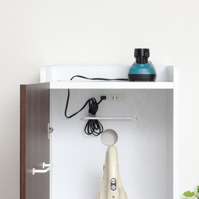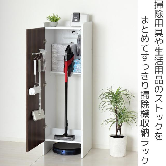 掃除機収納 ラック 幅43.5cm 2口コンセント付 ( 掃除機収納庫 クリーナー 収納 棚 玄関収納 掃除機 掃除機スタンド 片付け 物置 整理 省スペース ブラウン ホワイト コンセント付 )