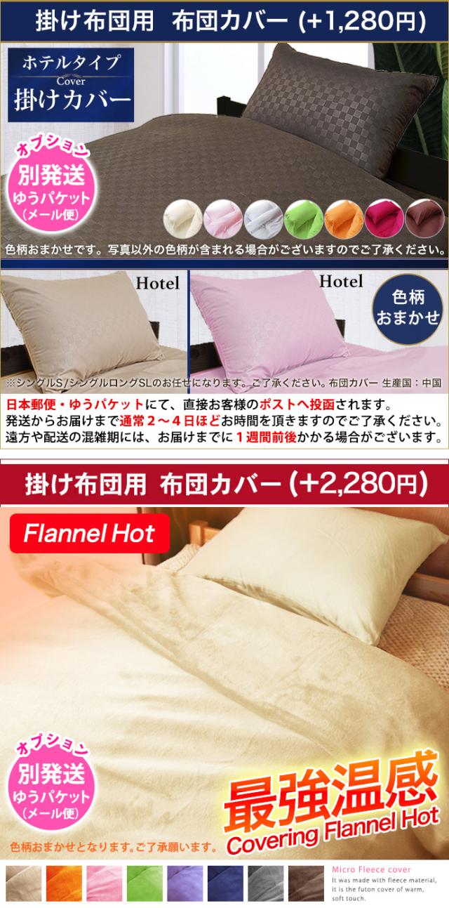 オプションの布団カバーはシングルS、シングルロングSLのおまかせになります。カバーの色・柄はおまかせです。予めご了承ください。