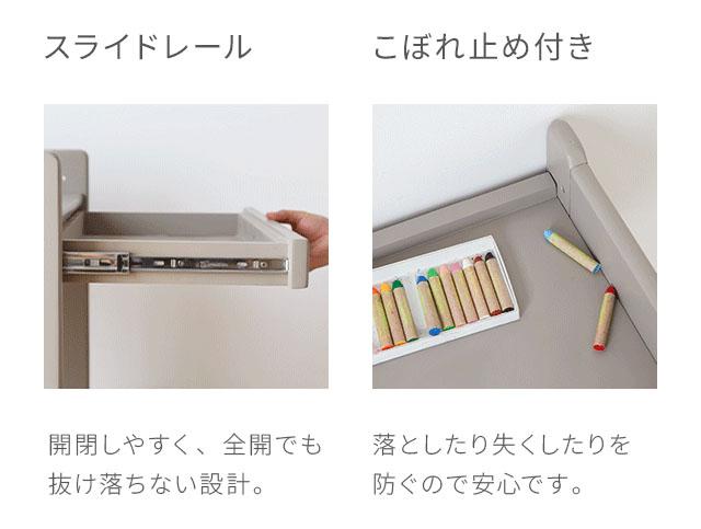仕切り板などはあえてなく無くし、目いっぱい自由に、引き出しの中を使えます。スライドレールで開閉しやすく、全開でも抜け落ちない設計です。