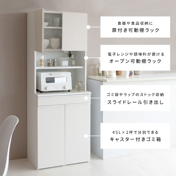 電子レンジや食器、調味料が収納できるラック付きで、デッドスペースになりがちなゴミ箱上を有効活用できます。