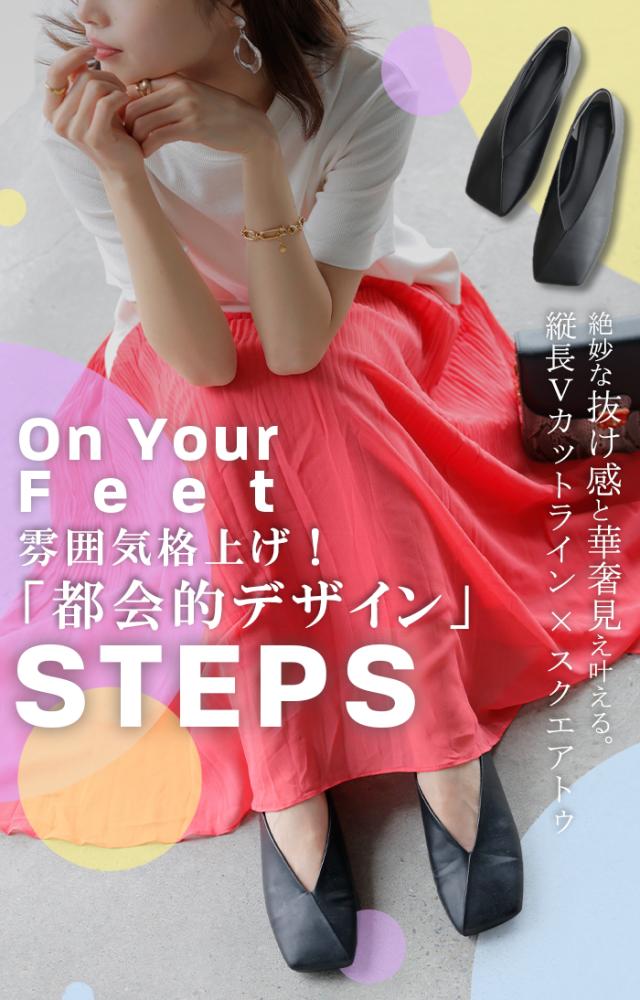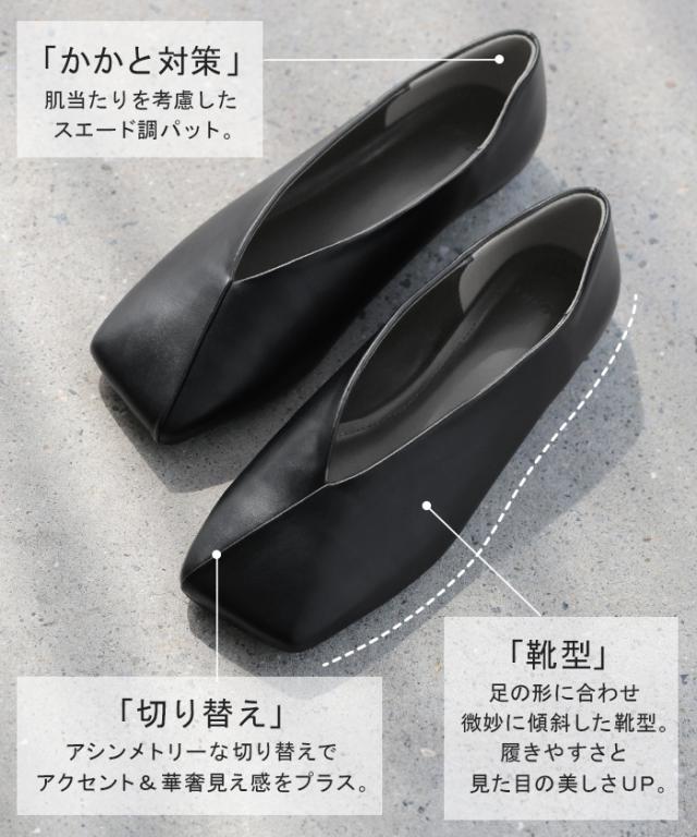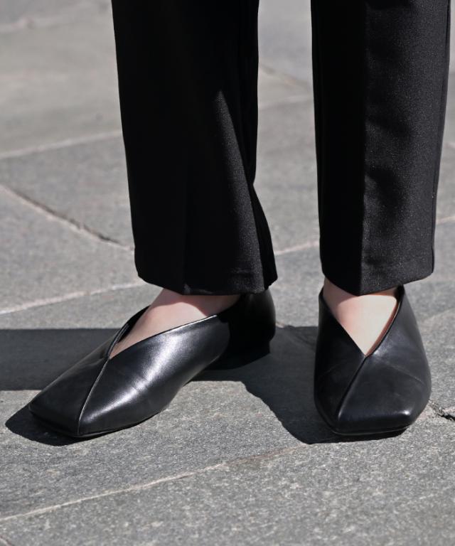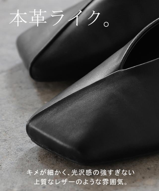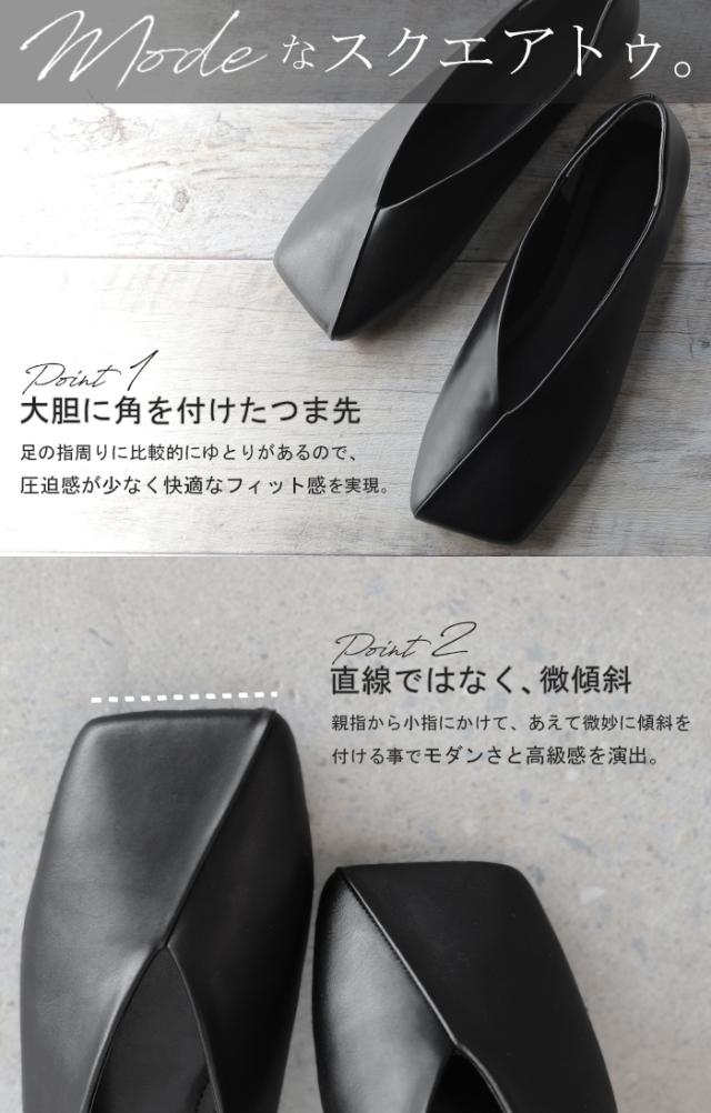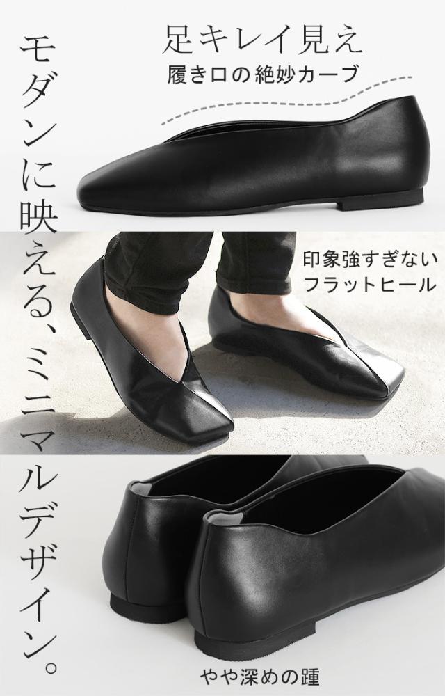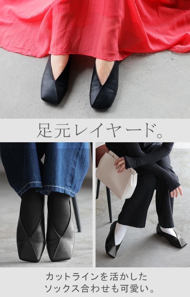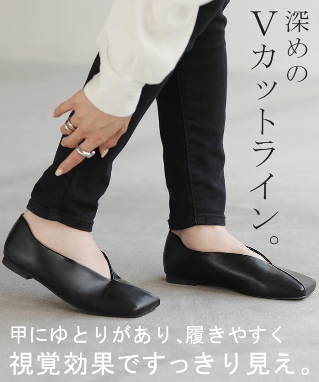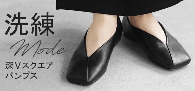 シンプルでありながらオシャレ見えする深Vスクウェアパンプス。
