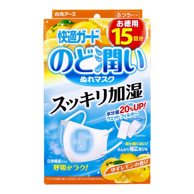 白元アース 快適ガード のど潤いぬれマスク ふつうサイズ ゆずレモンの香り 15セット入り X3箱
