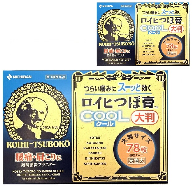商品説明『ロイヒつぼ膏クール大判 』●ロイヒつぼ膏TMクール大判は、有効成分のサリチル酸メチル、l-メントールなどの鎮痛消炎成分がつらい腰痛・肩こり・関節痛にすぐれた効果をあらわします。●ひとりで簡単に貼れる、目立たない丸形のプラスターです。●大判なので広い範囲のこりや痛みに適しています。【ロイヒつぼ膏クール大判 詳細】膏体100g中サリチル酸メチル6.7gl-メントール6.7gdl-カンフル3.3g添加物として スチレン・イソプレン・スチレン共重合体、テルペン樹脂、水素添加ロジングリセリンエステル、流動パラフィン、ジブチルヒドロキシトルエン(BHT)、香料、その他1成分 を含有。原材料など商品名ロイヒつぼ膏クール大判内容量78枚販売者ニチバン株式会社保管及び取扱い上の注意(1)小児の手のとどかない所に保管してください。(2)直射日光をさけ、なるべく湿気の少ない涼しい所に保管してください。(3)誤用をさけ、品質を保持するため、開封後は、チャックを合わせ閉じて、保管してください。(4)使用期限を過ぎた製品は使用しないでください。用法・用量1日数回患部に貼付する。(1)小児に使用させる場合には、保護者の指導監督のもとに使用させてください。(2)皮ふの弱い人は、使用前に腕の内側に1cm角の小片を目安として半日以上貼り、発疹・発赤、かゆみ、かぶれ等の症状が発現しないことを確かめてから使用してください。(3)皮ふの弱い人は、同じところには続けて貼らないでください。(4)汗などをよく拭きとり、患部をきれいにしてからお貼りください。(5)外用にのみ使用し、内服しないでください。効果・効能腰痛、肩こり、関節痛、筋肉痛、筋肉疲労、打撲、捻挫、骨折痛ご使用上の注意(守らないと現在の症状が悪化したり、副作用が起こりやすくなります)1.次の部位には使用しないでください。 (1)目の周囲、粘膜等。 (2)湿疹、かぶれ、キズぐち。1.次の人は使用前に医師、薬剤師又は登録販売者に相談してください。 (1)本人又は家族がアレルギー体質の人。 (2)薬や化粧品等によりアレルギー症状(例えば発疹・発赤、かゆみ、かぶれ等)を起こしたことがある人。2.使用後、次の症状があらわれた場合は副作用の可能性があるので、ただちに使用を中止し、この説明書を持って医師、薬剤師又は登録販売者に相談してください。[関係部位:症状]皮ふ:発疹・発赤、かゆみ、はれ、かぶれ、色素沈着、皮ふはく離等3.5〜6日間使用しても症状の改善がみられない場合は、使用を中止し、この説明書を持って医師、薬剤師又は登録販売者に相談してください。◆ 医薬品について◆医薬品は必ず使用上の注意をよく読んだ上で、 それに従い適切に使用して下さい。◆購入できる数量について、お薬の種類によりまして販売個数制限を設ける場合があります。商品に関するお問い合わせお問い合わせ先ニチバン株式会社 お客様相談室電話:0120-377218受付時間:9:00〜12:00、13:00〜17:00(土、日、祝日を除く)区分日本製・第3類医薬品商品仕様シリーズ名 ロイヒつぼ膏クール大判ブランド名 ニチバン原産国/製造国 日本効能・悩み・目的 肩こり・腰痛・筋肉痛内服薬・外用薬 外用薬用法・用量 つぼに貼って痛みにスーッと効くクールタイプ大判形状 貼付剤、テープ剤内容量 78枚入り×2個セット