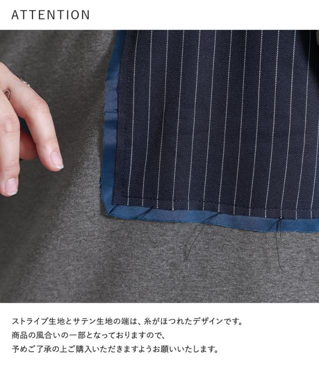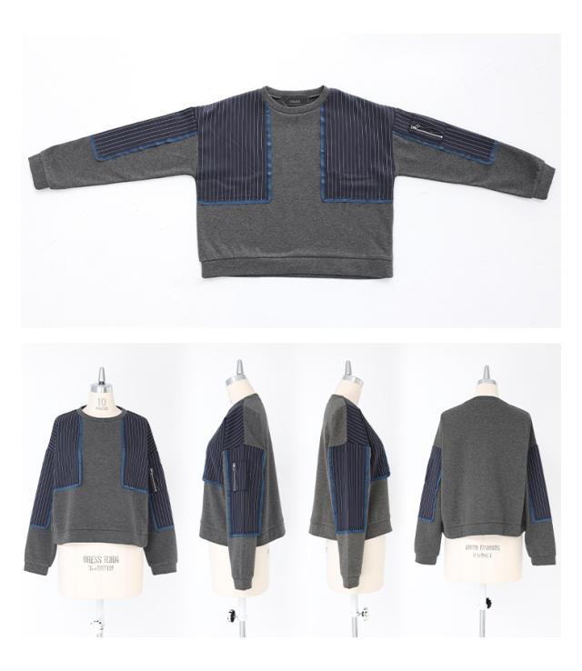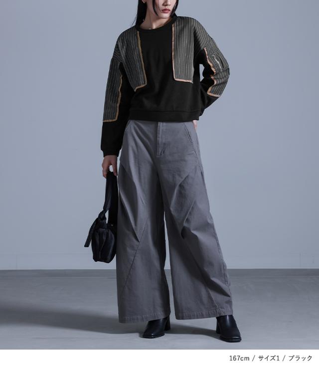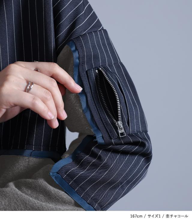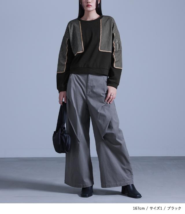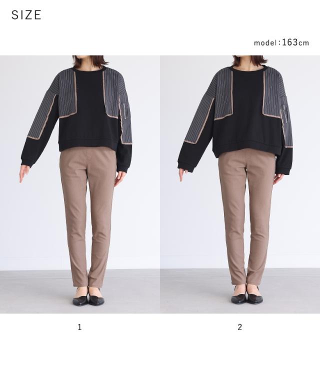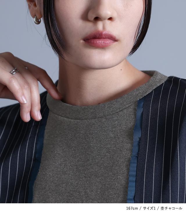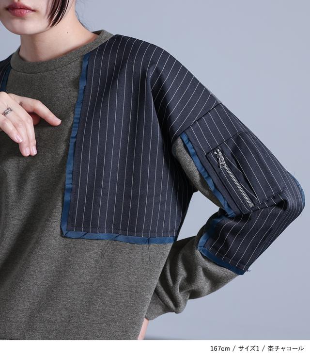 ■デザイン 裏シャギーのスウェット生地に配色のサテン生地とストライプ生地をドッキングした、暖かく着られるデザイントップス。サテン生地とストライプ生地は製品洗いをかけて、わざと端がほつれる仕様にしています。左袖に施した、タックを取って立体的にしたファスナーポケットがアクセントになります。 ■コーディネート 少し短めの丈感で、パンツにもスカートにも合わせやいデザイン。ラフな印象のトップスなので、女性らしいスカートや、キレイめなパンツでバランスをとるのがおすすめです。 ■素材 程良い厚みでもちもちとした、肌触りの良い暖かい裏シャギーのスウェット生地。カジュアルかつキレイめな印象のストライプ生地と、光沢感のあるサテン生地をドッキングしました。 |