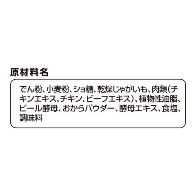 | でん粉、小麦粉、ショ糖、乾燥じゃがいも、肉類(チキンエキス、チキン、ビーフエキス)、植物性油脂、ビール酵母、おからパウダー、酵母エキス、食塩、調味料 |