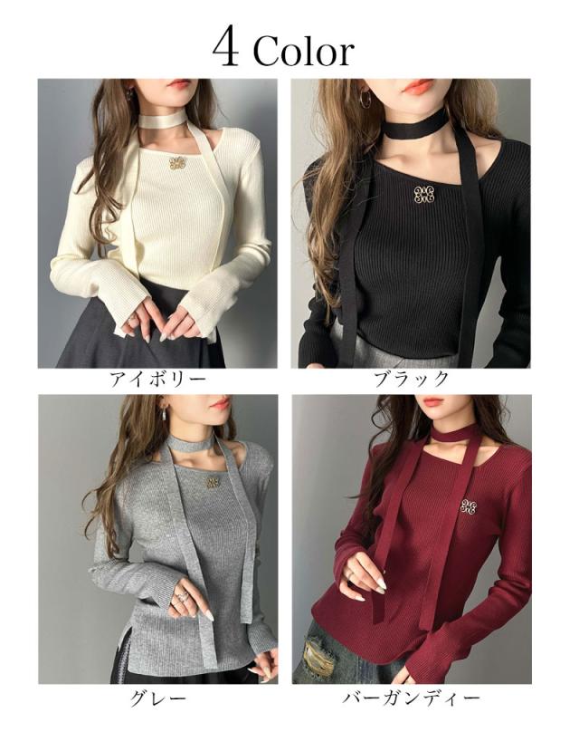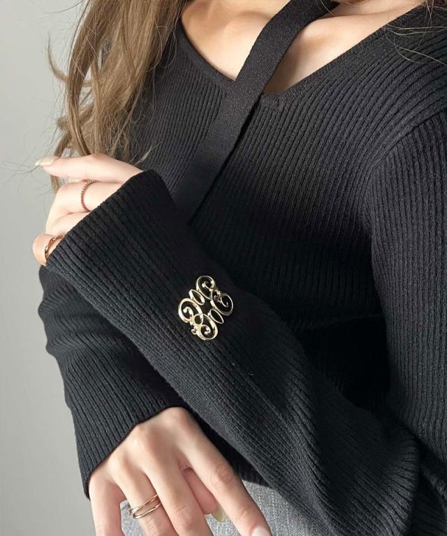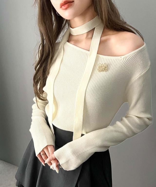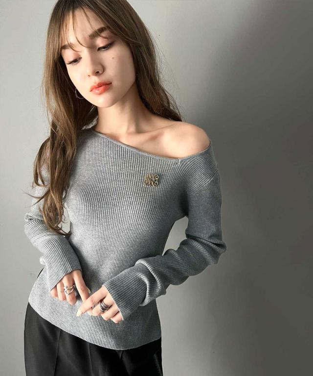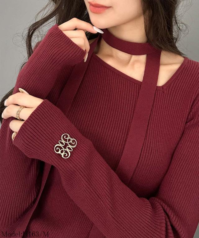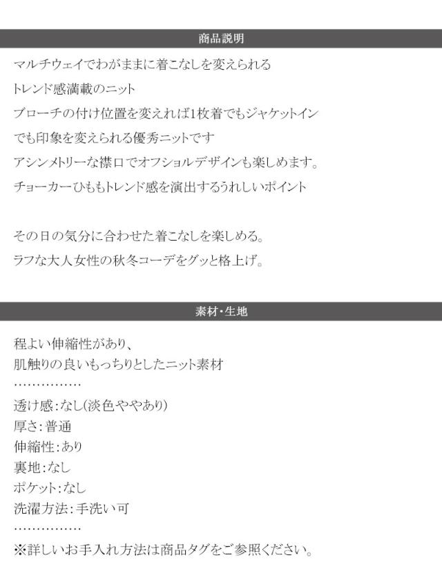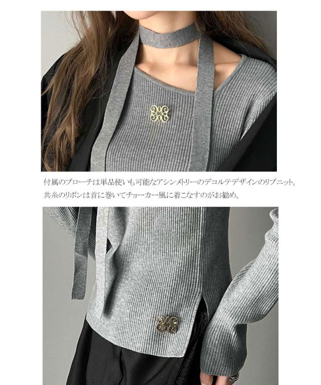 クラシカルエルフ秋新作 mily bilet トップス ニット レディース ブローチ付き アシンメトリー オフショル ワンショル チョーカー マルチウェイ サイドスリット コンパクト カジュアル セーター 大きいサイズ 2024aw mi1029085