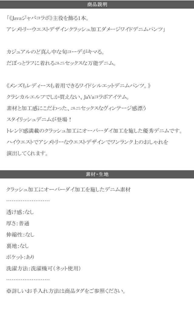 クラシカルエルフ春新作 javaジャバコラボ ボトムス パンツ レディース アシメトリー ウエスト デザイン クラッシュ 加工 ヴィンテージライク ダメージ ワイド デニム 男女兼用 ユニセックス メンズ 大きいサイズ 2026ss jv0909004