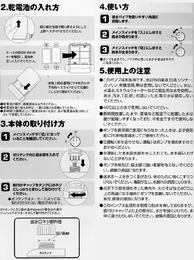 ポリタンクに付けて色々使える アウトドアポンプ 単一アルカリ乾電池 2本付