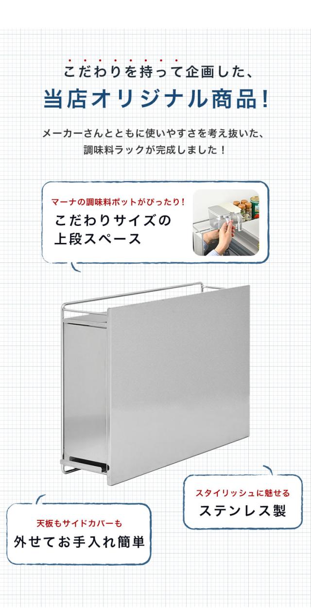 日本製、燕三条製、国産、ステンレス製、調味料ラック、スパイスラック、引き出し、引出し、収納、ドロワー、マーナ、調味料ポット、コンロ横ラック、コンロサイドラック、油跳ねカバー、油跳ねガード、油はねカバー、油跳ねガード
