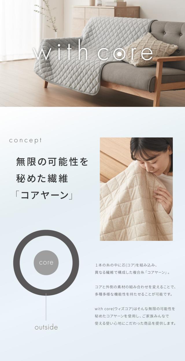 with、core、ウィズコア、マルチカバー、キルトマルチカバー、ソファカバー、ブランケット、掛け布団、掛布団、コアヤーン糸、コアヤーン繊維、複合繊維、吸水、速乾、乾きやすい、再生ポリエステル、エコ、SDGs