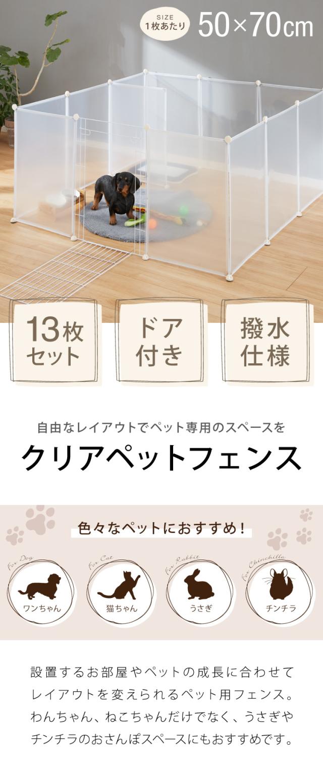 ペットフェンス、ジョイント、ドア付き、透明、50×70cm、13枚、組立簡単、置くだけ、レイアウト自由、防水、ペット、室内、屋内、ペットサークル、柵、ドッグ、ケージ、パーテーション、間仕切り、ペット用品、ペットグッズ、ジョイント式、フェンス、わんちゃん、ねこちゃん、ケージ、犬、猫、侵入防止、工具不要、コンパクト、レイアウト、ジョイントマット、サークル