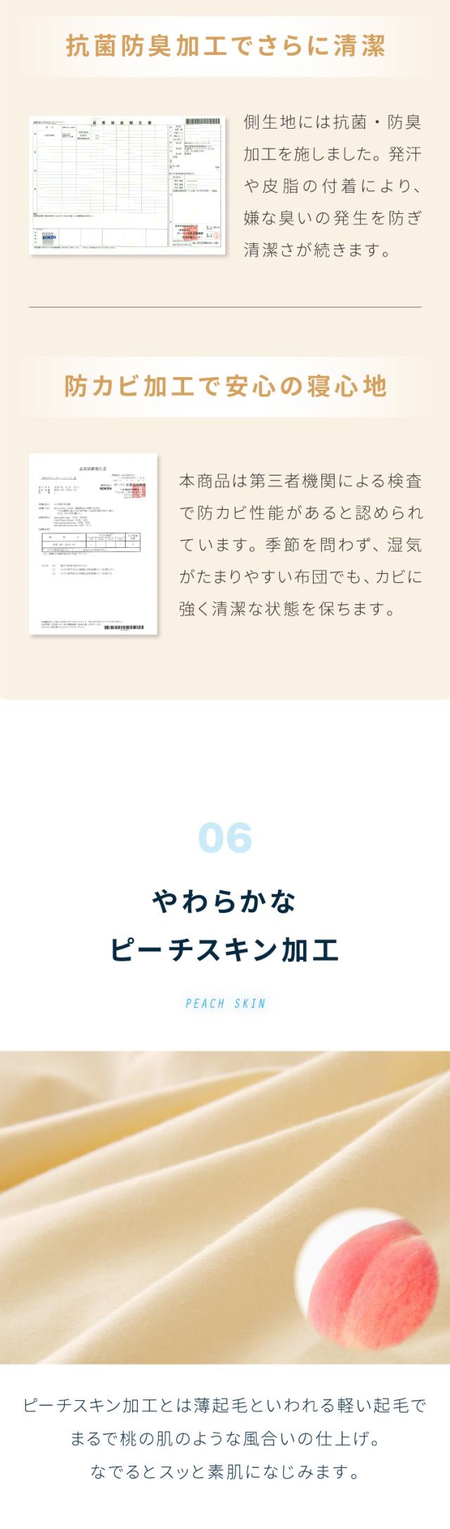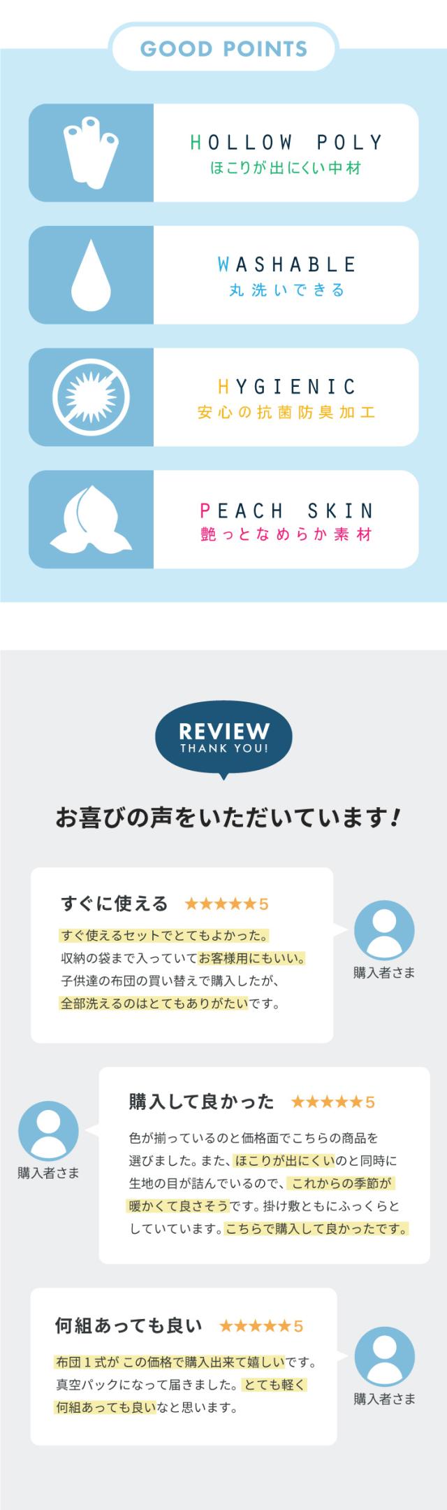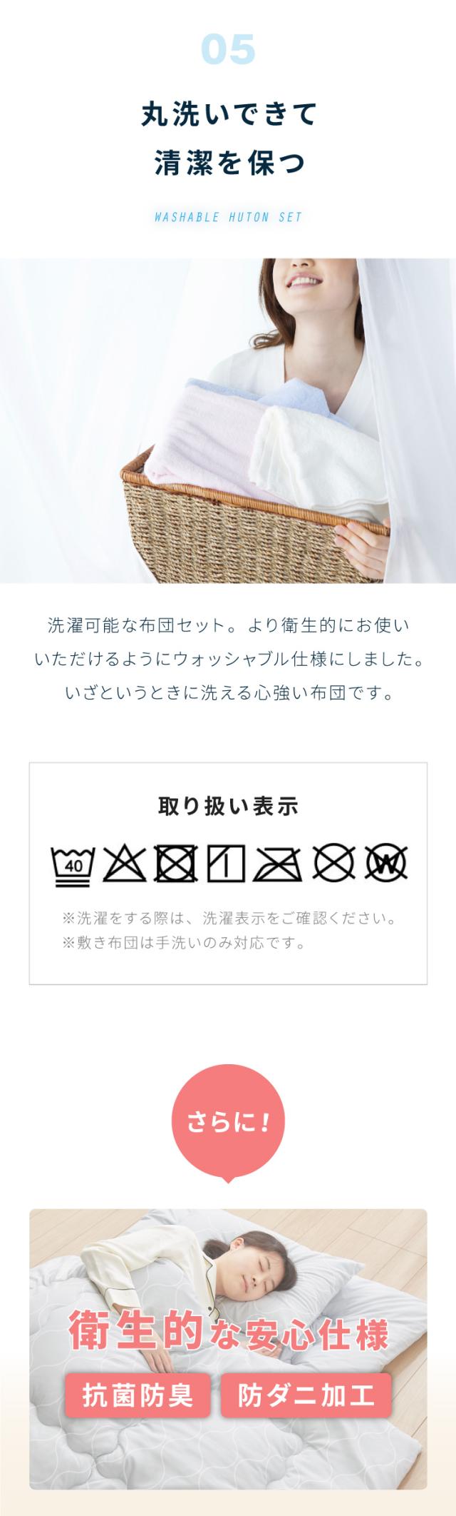 4点セット ほこりの出にくい布団 | 4点セット 洗える×抗菌防臭 | 5点セット 折りたたみベッド対応 |