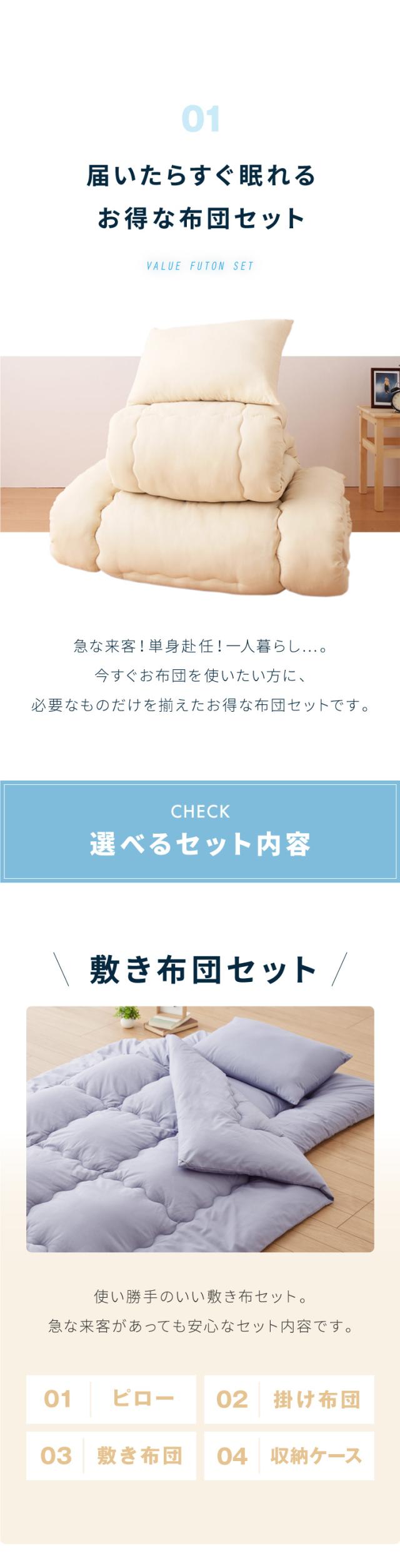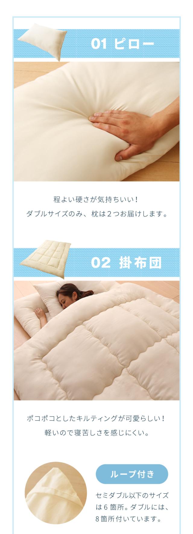 ピロー1個 (ダブルサイズのみ2個付き)、掛布団1枚、敷布団1枚、収納ケース1個
