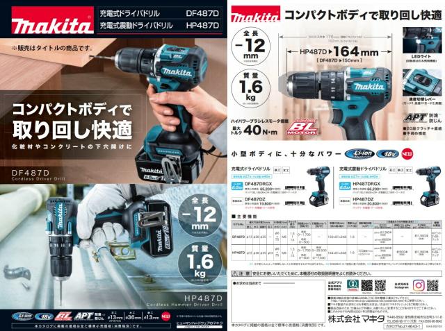 マキタ 充電式震動ドライバドリル HP487DZ+バッテリBL1860B+充電器DC18WC付 18V対応 makita 当店オリジナルセット品
