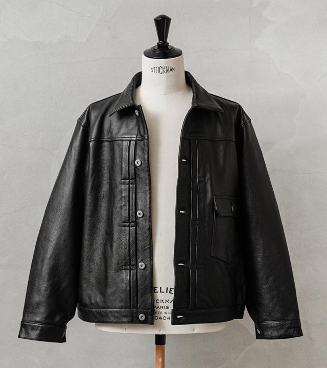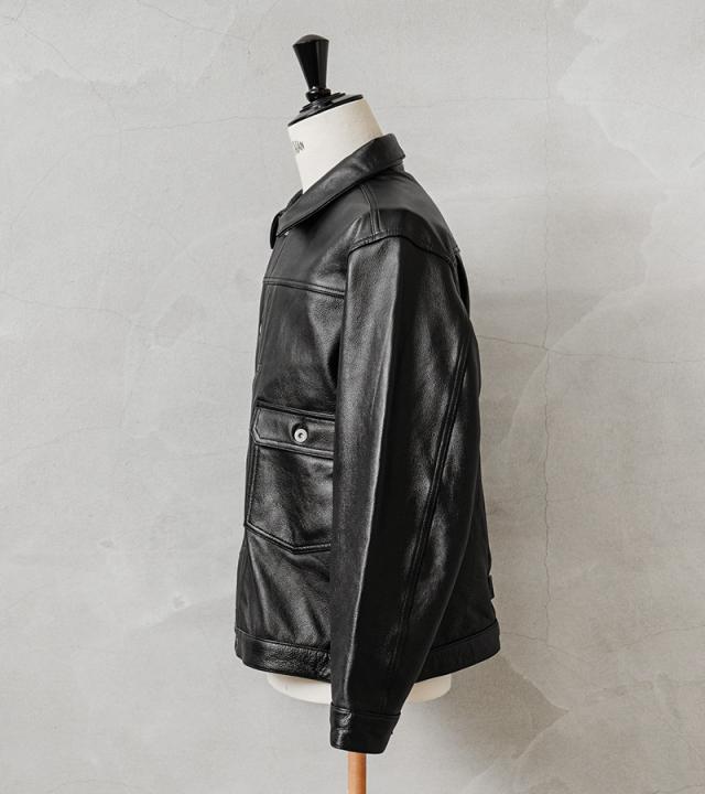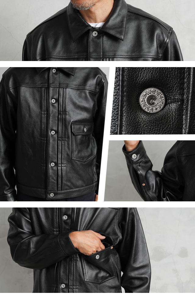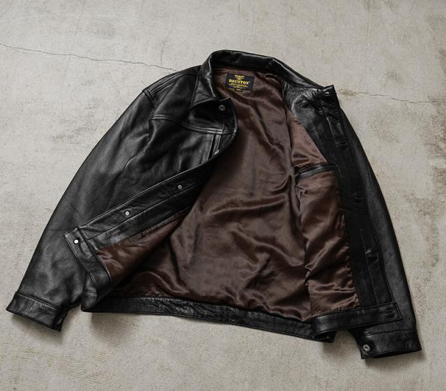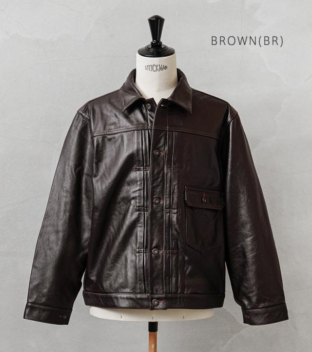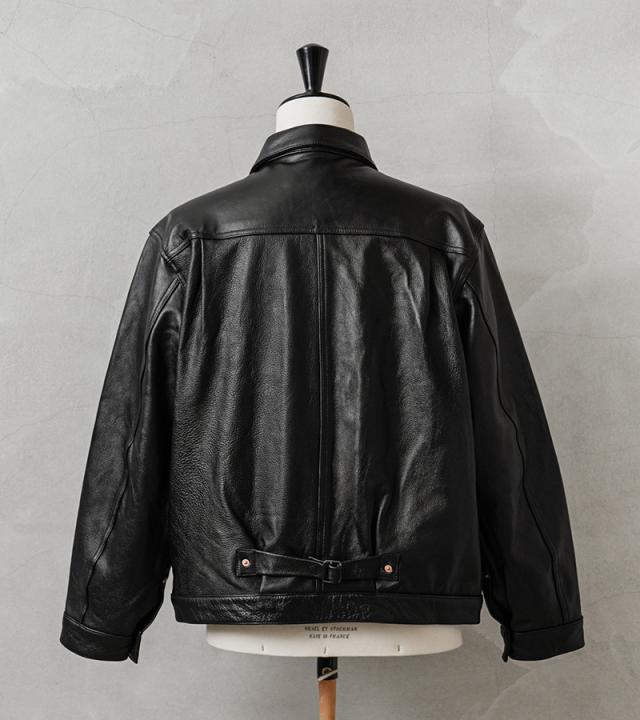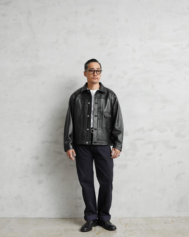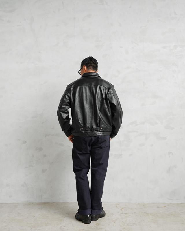 HOUSTONからやや厚手で、丈夫ながらも柔らかなカウレザーを使用した、1stタイプのトラックジャケットが登場しました。通称“1st”と呼ばれる1936年に誕生したデニムジャケットを元に作られており、当時46サイズ以上に採用されていた背中にハギの入った“Tバック”デザインを採用。フロントの裾までつづくプリーツデザインやボックスステッチ、左胸のフラップ付きポケット、腰に配置されたフィット感を調整するためのシンチバッグ、補強のためのリベット、月桂樹ドーナツボタンなど、ヴィンテージならではのディティールを余すことなく取り入れています。