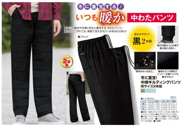 冬に重宝!中綿キルティングパンツ 2本組 ブラック 中綿パンツ ズボン キルトパンツ 黒 メンズ 紳士服 シニア 男性 無地 シンプル 中わた 防寒 あったかパンツ 暖かい あったかい シニアファッション 40代 50代 60代 70代 80代 父の日 お父さん おじいちゃん 秋冬